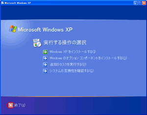 Windows XPのインストールCDをセットすると、右のような画面が表示されることがあります。 この画面はここで説明している操作とは関係ありませんので、[終了]ボタンで閉じます。