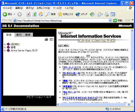 IISの製品概要(下図)が表示されれば、IIS 5.1は正常に動作しています。 ※ IISの製品概要が表示されない場合は、もう一度はじめからやり直してください。