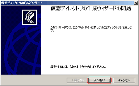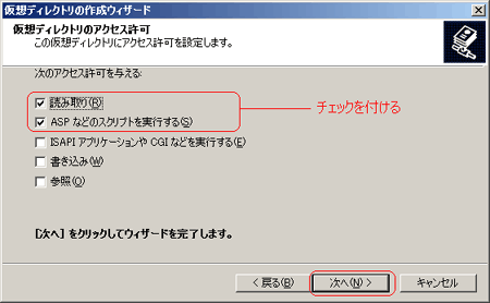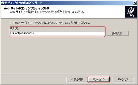 [パス]欄に「C:\Inetpub\Scripts」と入力し、[次へ]ボタンをクリックします。